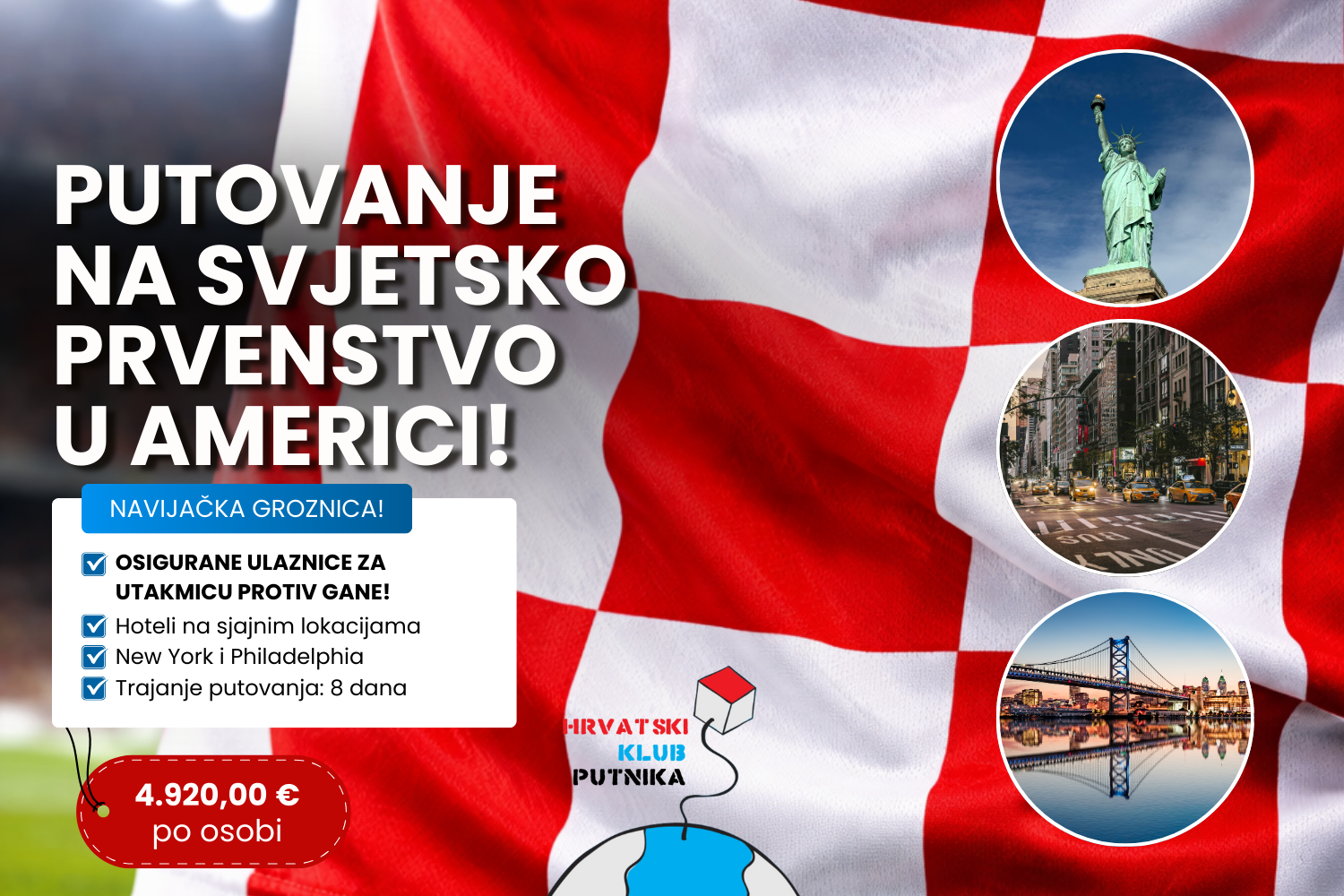 Svjetsko prvenstvo, Hrvatska na terenu, tribine pune strasti, ali i New York koji nikad ne spava, povijesna Philadelphia, legendarne ulice, neboderi, fan zone i večeri koje završavaju kasno, uz osmijeh i pjesmu. Ovaj program spaja ono najbolje iz dva svijeta: veliki nogometni spektakl i veliko putovanje.
